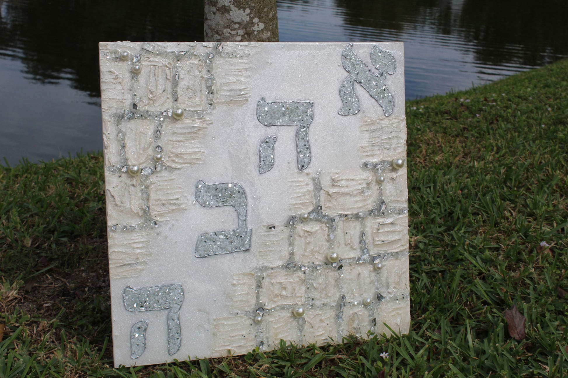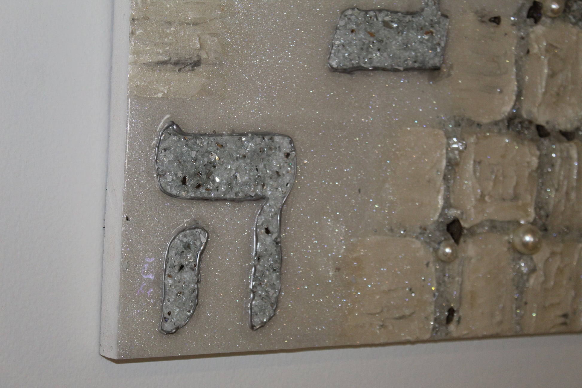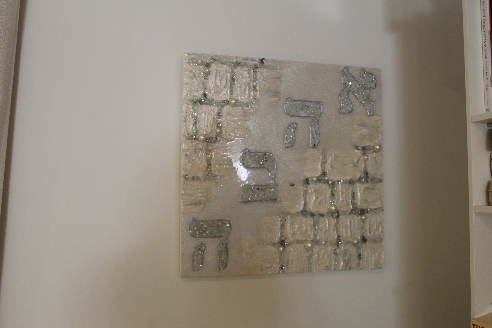 Inspired by the resilience of our people and the enduring spirit of Jerusalem, this piece features the Western Wall and the word Ahava (love) in Hebrew. Created with resin, stones, textures, and endless love, it reminds us that after the heartbreak of October 7, it is through love that we will rebuild- our hearts, our homes, and our Temple.