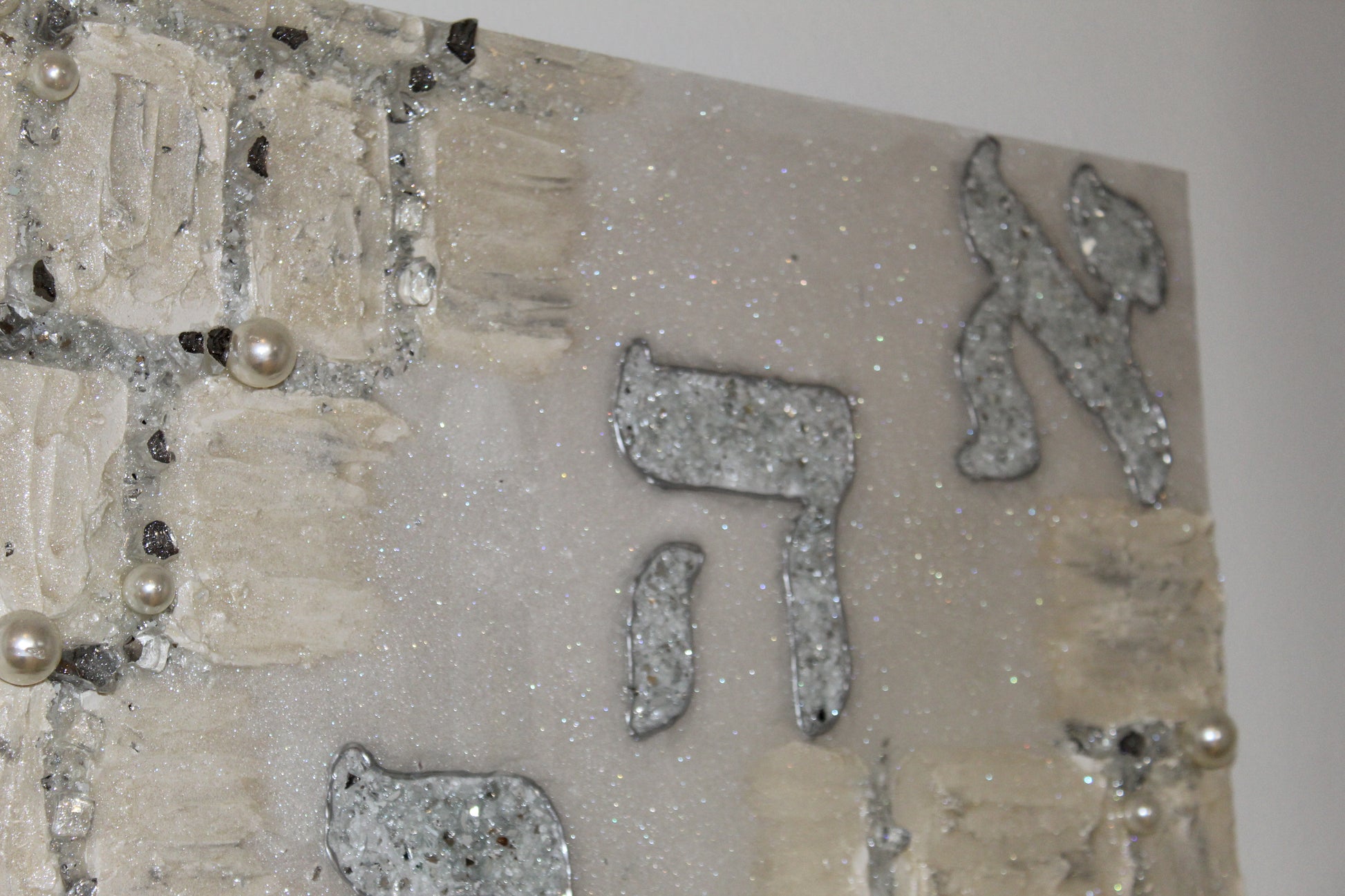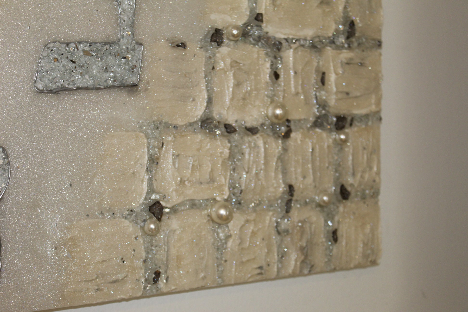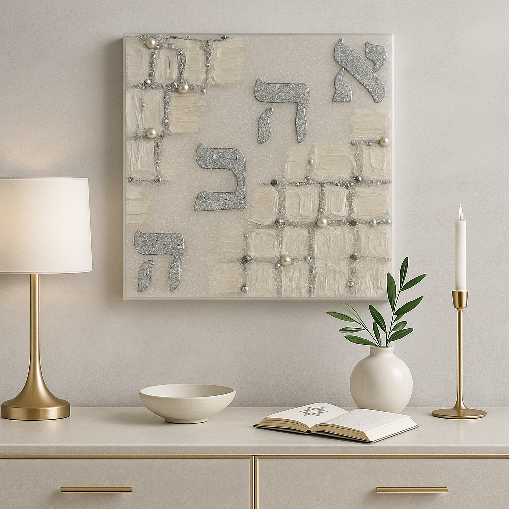 Inspired by the resilience of our people and the enduring spirit of Jerusalem, this piece features the Western Wall and the word Ahava (love) in Hebrew. Created with resin, stones, textures, and endless love, it reminds us that after the heartbreak of October 7, it is through love that we will rebuild- our hearts, our homes, and our Temple.