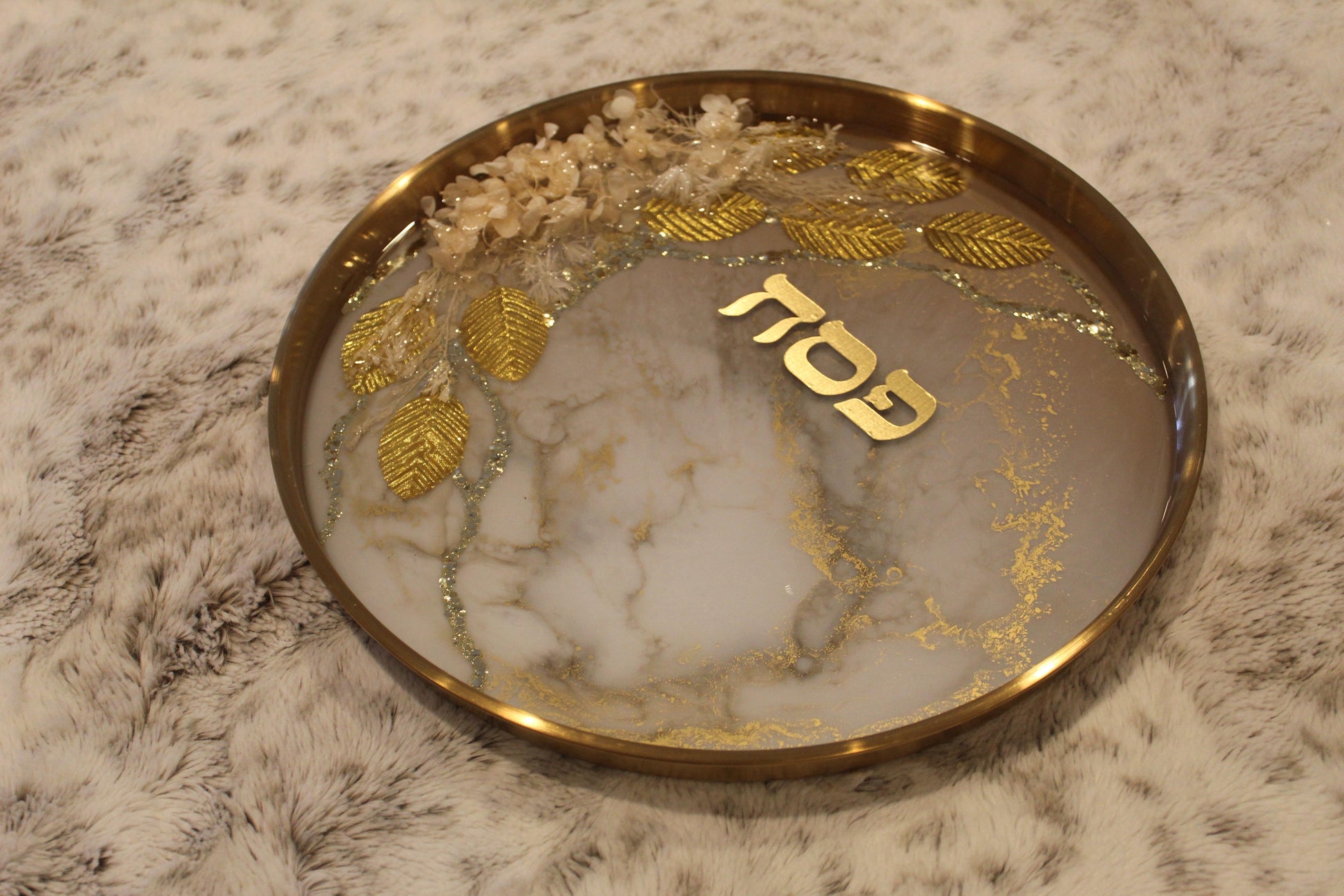 Each Esthetic By Estee K Seder plate is created to elevate this sacred moment. Handcrafted individually using layered resin techniques, every piece is completely unique. The flowing textures, gold accents, and carefully chosen elements create a design that feels both timeless and luxurious, bringing beauty and intention to your Pesach table.